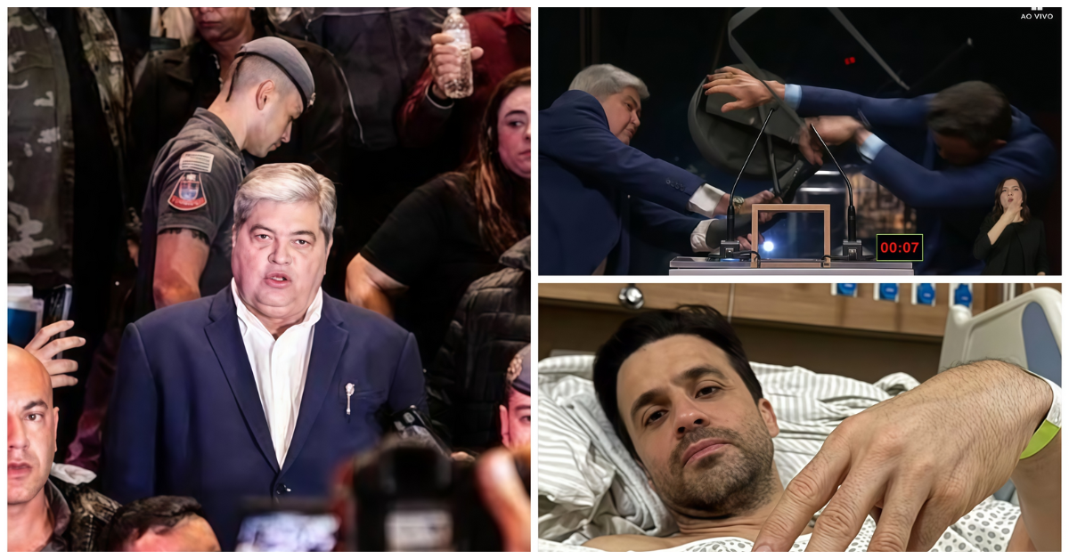 Datena se aproximou do púlpito de Marçal e bateu nele com uma cadeira. Marçal se defendeu com os braços. Seguranças entraram no palco, e a TV Cultura chamou o intervalo, exibindo imagens de programas antigos da emissora.