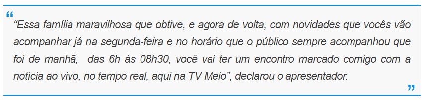 Dudu comandará o Bom Dia de segunda a sexta-feira, das 6h às 8h30. Vale lembrar que, em novembro de 2023, ele assumiu o MN 40º (hoje Brasil 40º), mas deixou o programa em junho de 2024 por conta das eleições.