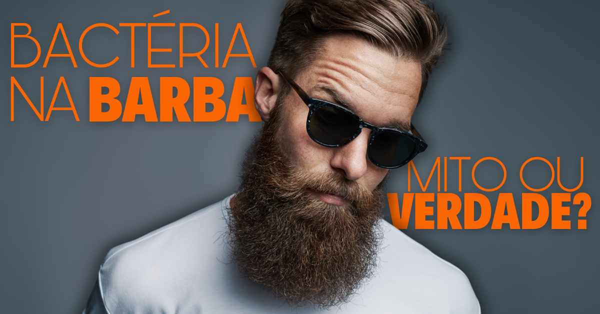 Homem com barba densa ao centro, com os dizeres “Bactéria na barba: mito ou verdade?” ao fundo; imagem conceitual sobre higiene facial