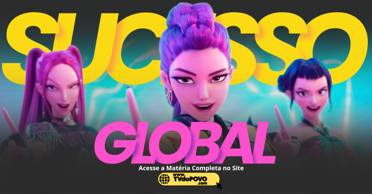 Personagens da animação Guerreiras do K-pop em destaque com a palavra Sucesso Global.