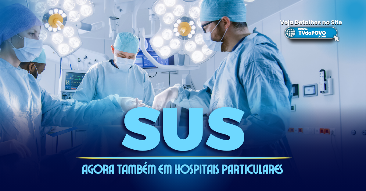 médicos operando em hospital com letreiro destacando atendimento do SUS em hospitais particulares