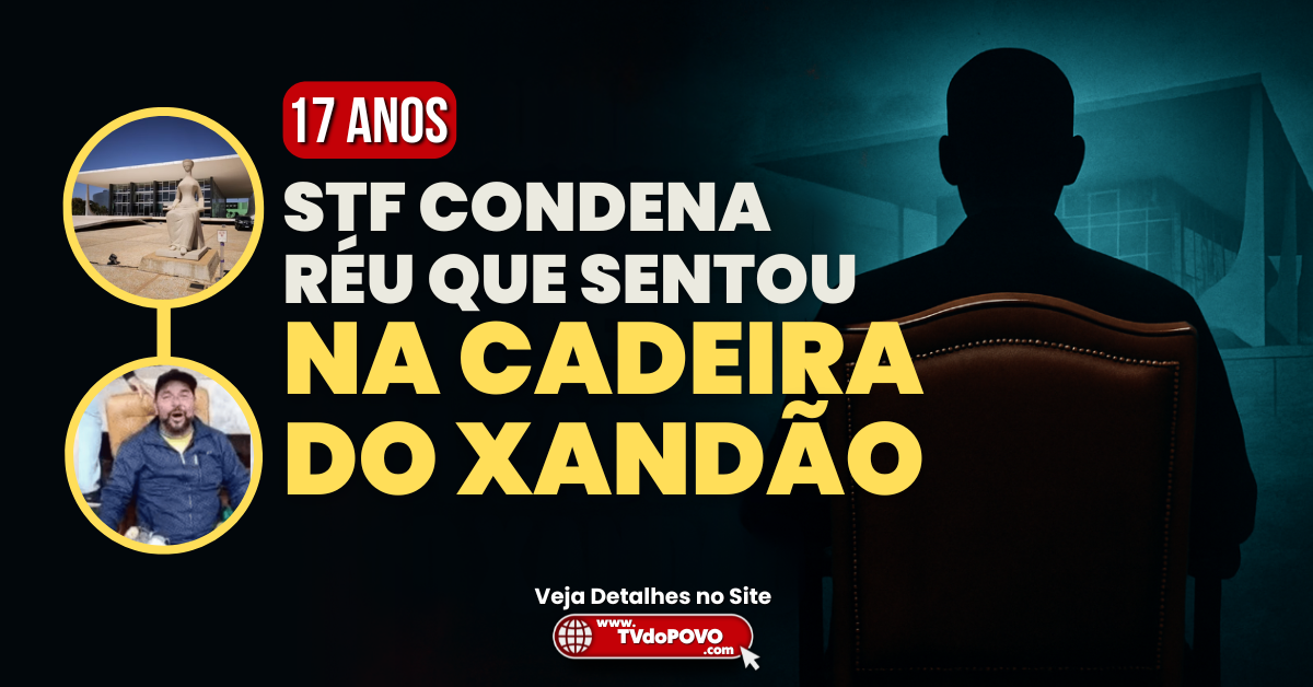 Arte com silhueta de homem em cadeira do STF, título “STF condena réu que sentou na cadeira do Xandão” e selo “17 anos” em destaque