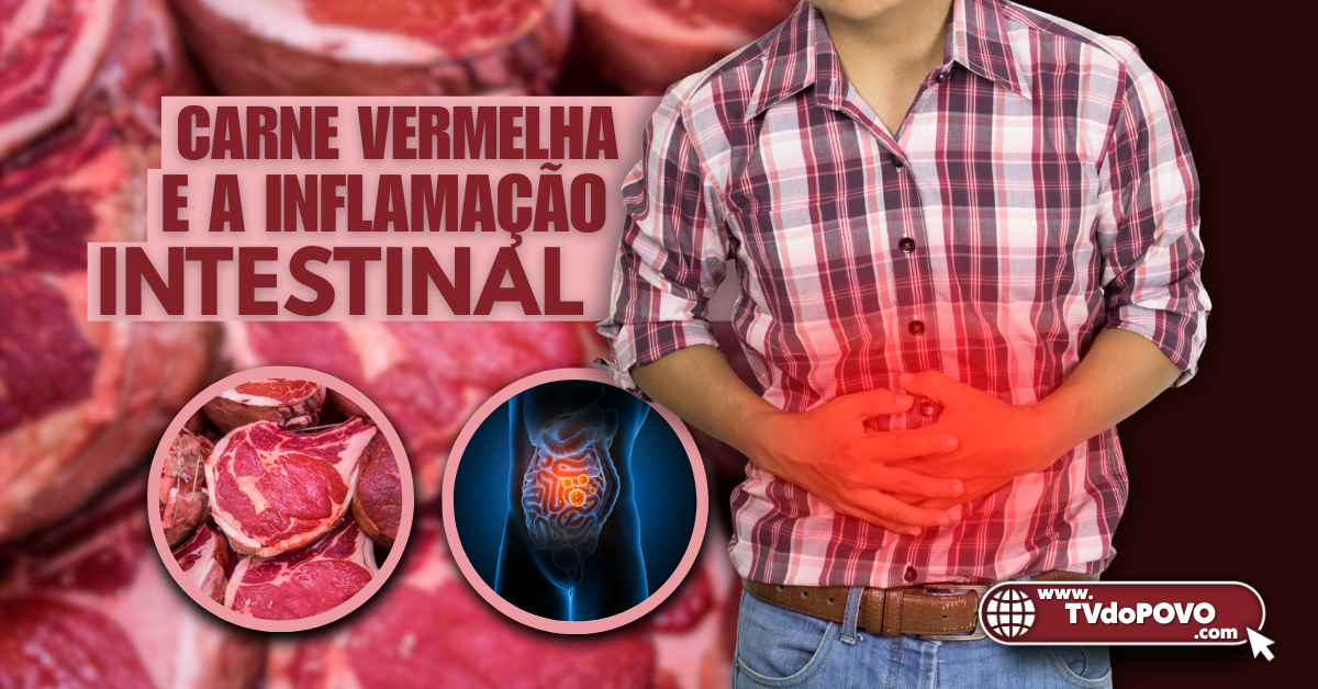 Homem com dor abdominal em destaque, carne vermelha e ilustração de intestino inflamado representam os riscos do consumo excessivo.
