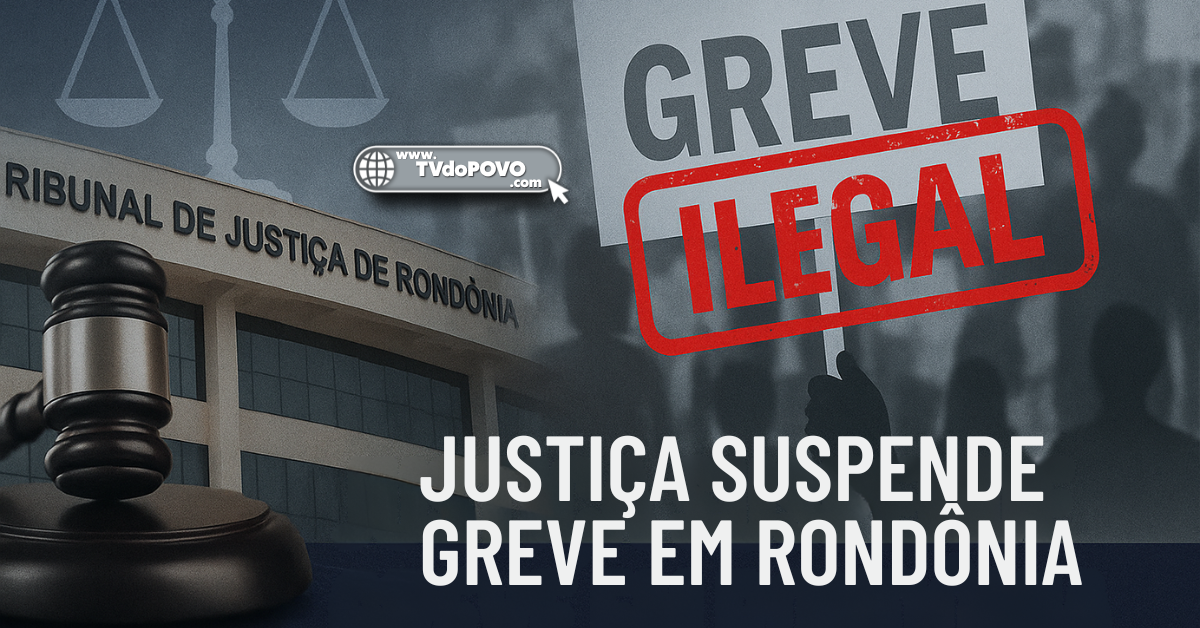 Fachada do Tribunal de Justiça de Rondônia e cartaz com a palavra “Greve Ilegal”, representando a suspensão da paralisação dos trabalhadores da educação no estado.