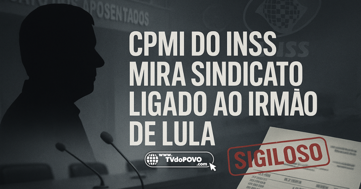Silhueta de homem em plenária com microfones, ao lado da frase "CPMI do INSS mira sindicato ligado ao irmão de Lula", com carimbo SIGILOSO sobre extrato bancário.