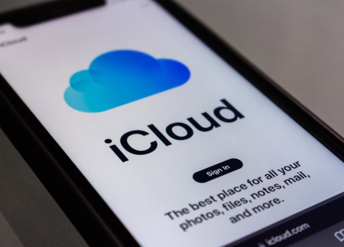 Mão segura celular com tela do iCloud; alerta de golpe com phishing em convite de calendário