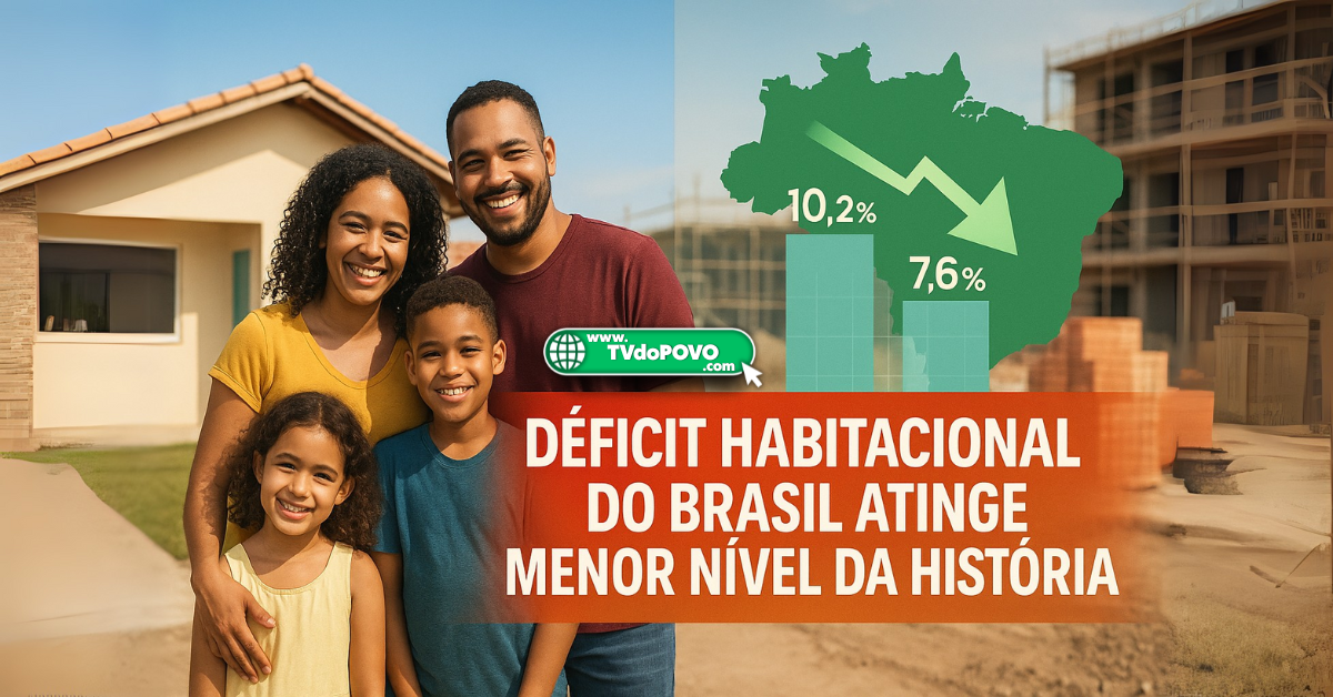 Família brasileira sorri em frente a casa popular; ao lado, gráfico mostra queda do déficit habitacional de 10,2% para 7,6% no Brasil.