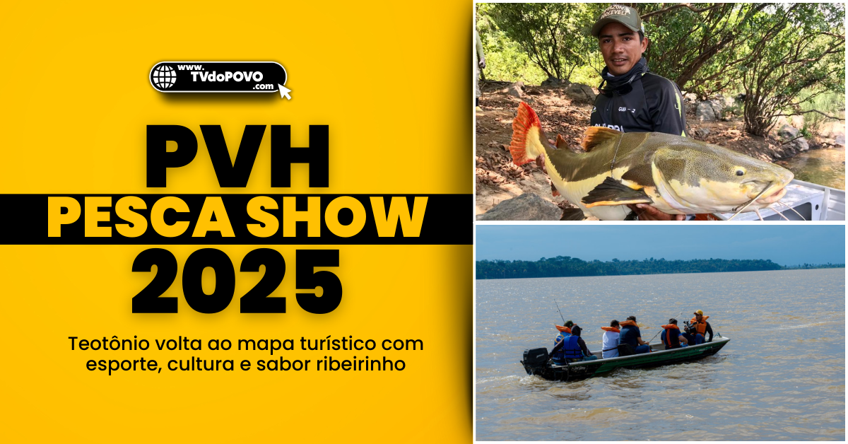 Arte oficial do PVH Pesca Show 2025, promovido em Teotônio com foco em turismo sustentável, pesca esportiva e gastronomia amazônica