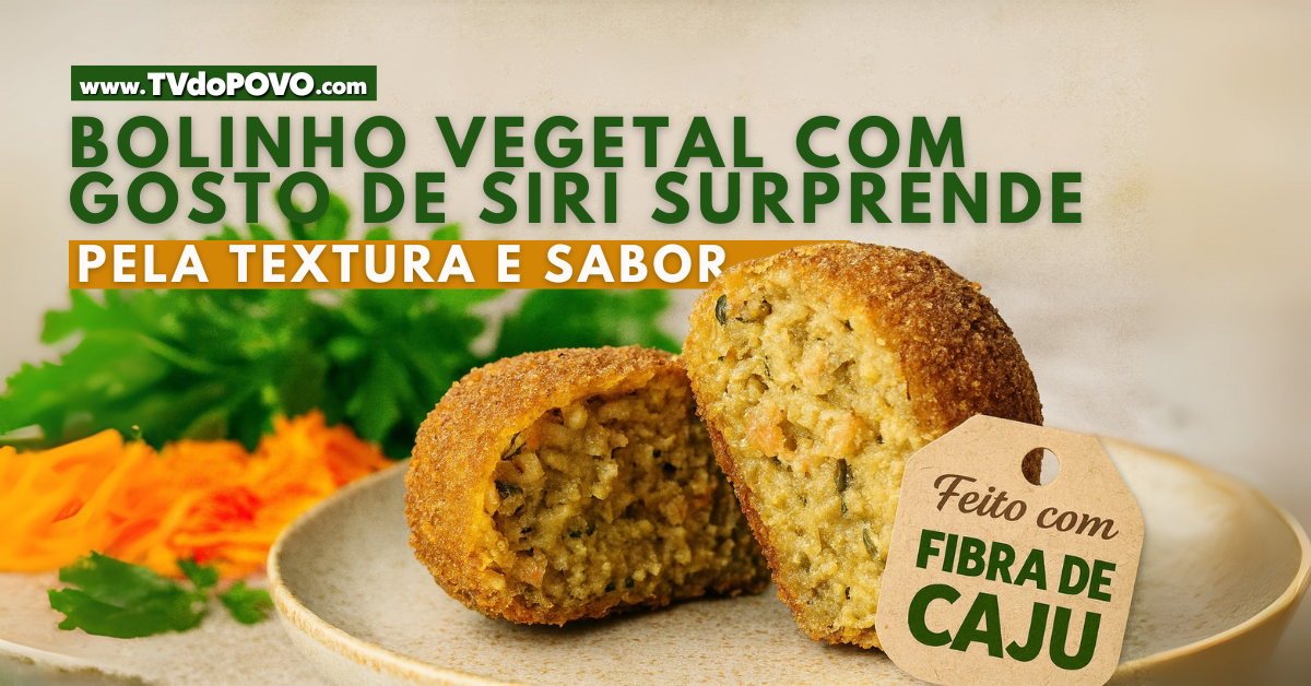 Imagem mostra bolinho vegetal cortado ao meio com interior visível, acompanhado da frase “feito com fibra de caju” e destaque para textura e sabor.