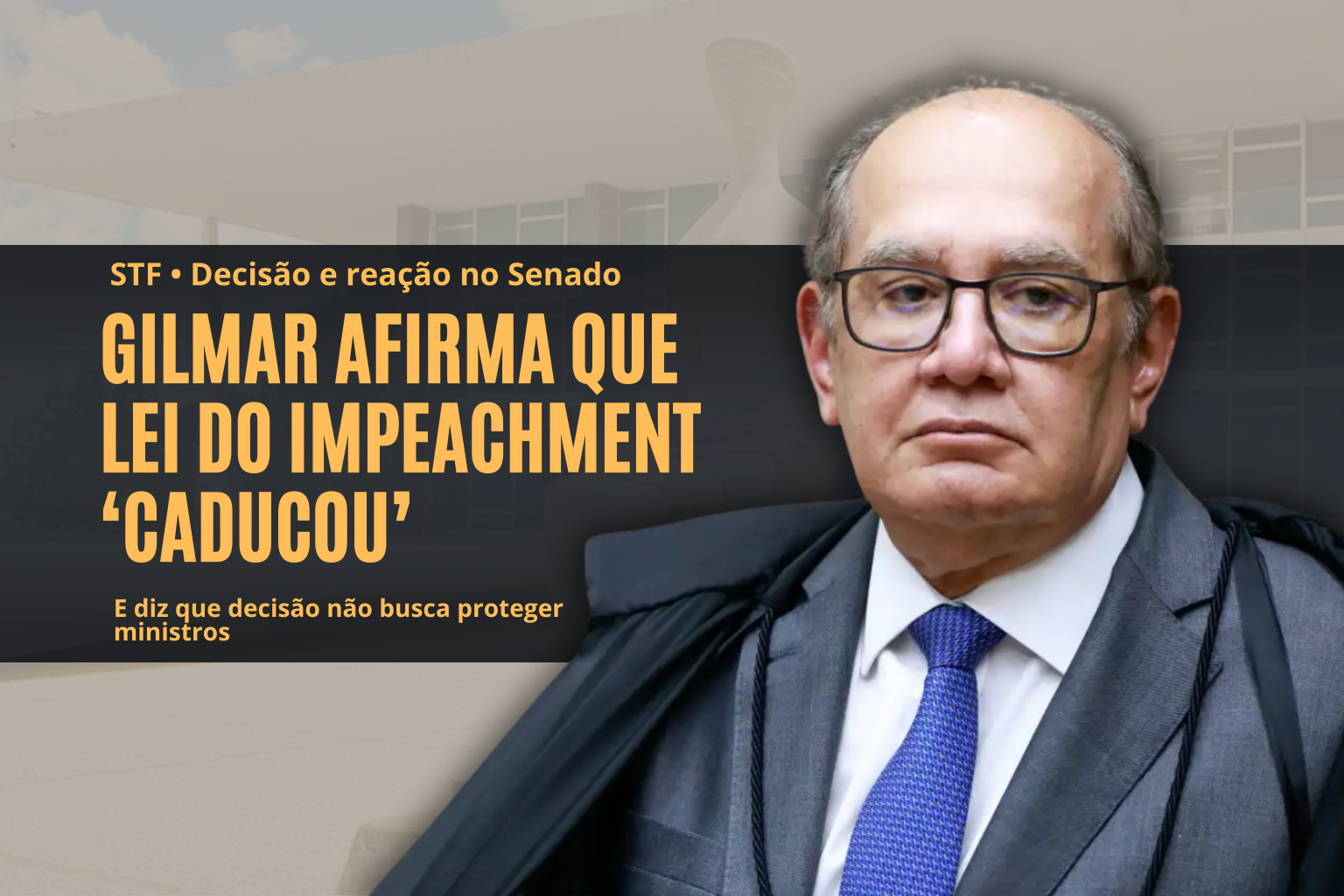 O ministro Gilmar Mendes afirmou que a lei do impeachment caducou e que sua decisão sobre limitar pedidos contra integrantes do Supremo Tribunal Federal não tem o objetivo de blindar magistrados. A medida determina que apenas a Procuradoria-Geral da República pode apresentar denúncias contra ministros do STF, mudança que reacendeu tensões entre Legislativo e Judiciário.