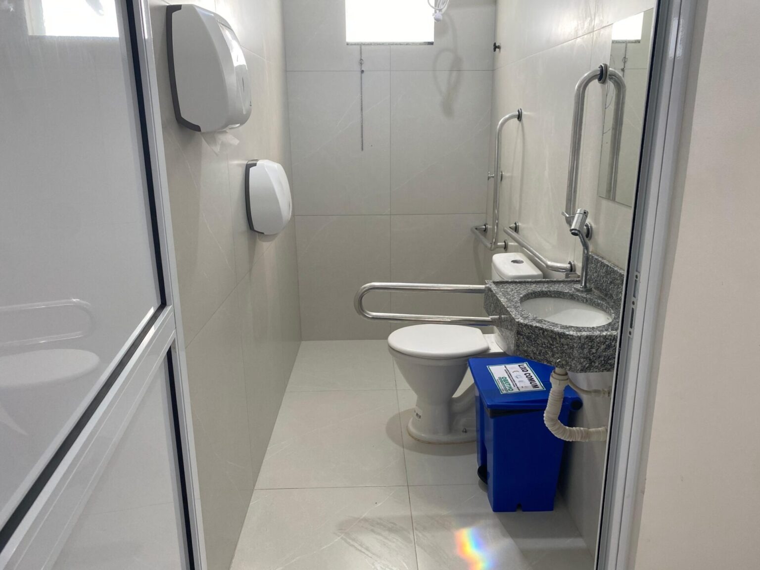 Os banheiros foram revestidos com porcelanato e elaborado com acessibilidade