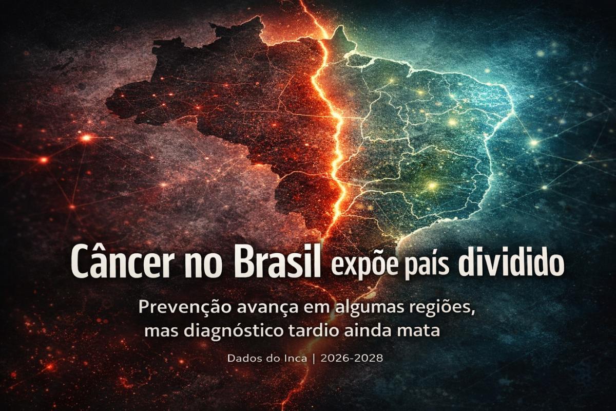 Imagem ilustra o contraste regional do câncer no Brasil, com avanço da prevenção em algumas áreas e diagnóstico tardio em outras.